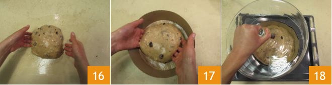 Formen Sie ihn dann zu einer Kugel 16 und legen Sie ihn in die Panettone-Form 17. Mit einer Glasglocke (oder etwas anderem, das das Wachstum des Panettones nicht beeinträchtigt) abdecken. 2 Stunden bei Raumtemperatur ruhen lassen, dann in den Kühlschrank stellen und 15 Stunden reifen lassen. Nach dieser Zeit den Panettone weitere 4 Stunden bei Raumtemperatur lassen, immer gut abgedeckt. Anschließend aufdecken und weitere zwei Stunden warten, damit er an der Oberfläche leicht antrocknet.