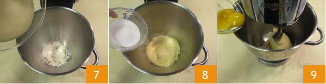 Fügen Sie nun den ersten Teig hinzu 7, fügen Sie den Zucker hinzu 8 und beginnen Sie mit dem Haken zu kneten. Wenn Sie eine glatte und homogene Masse erhalten haben, fügen Sie nach und nach die Eigelbe hinzu 9. Geben Sie auch das Salz hinzu, wenn der Teig die Eigelbe vollständig aufgenommen hat.