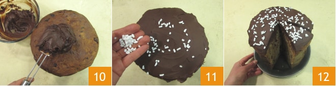 Nun den inzwischen abgekühlten Panettone nehmen, mit der inzwischen kalten und dicken Ganache dekorieren 10, nach Belieben mit Zuckerstreuseln bestreuen 11 und servieren 12.