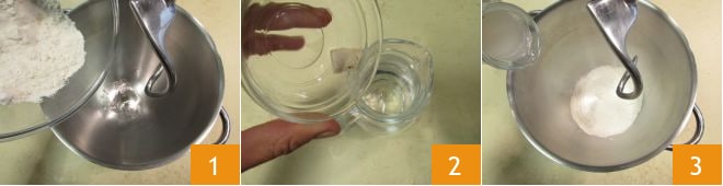 Um den Panettone mit Sauerkirschen und Schokolade vorzubereiten, beginnen Sie mit dem ersten Teig. Geben Sie das Manitoba-Mehl in die Schüssel einer Küchenmaschine mit Knetarm 1. Lösen Sie die Bierhefe separat in der angegebenen Menge Wasser auf 2 und geben Sie sie dann in die Küchenmaschine 3.