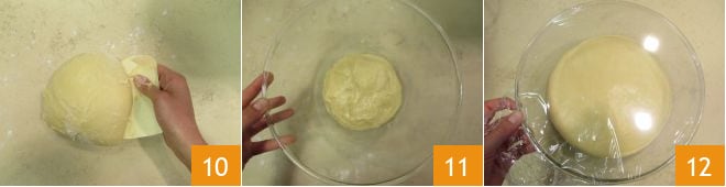 Formen Sie ihn zu einer Kugel 10. In eine Schüssel geben 11, mit Frischhaltefolie abdecken. Im ausgeschalteten Ofen mit eingeschaltetem Licht etwa 4-5 Stunden gehen lassen, dabei eine kleine Schüssel mit heißem Wasser auf den Boden stellen. Alternativ den Teig bei Raumtemperatur (26°) gehen lassen, fern von Zugluft, bis sich das Volumen verdoppelt hat 12.