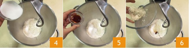 Fügen Sie den Zucker 4, das Malz 5 und die angegebene Menge Sauerteig hinzu 6.