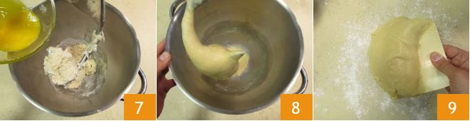 Beginnen Sie mit dem Kneten, wenn Sie eine homogene Masse erhalten haben, fügen Sie nach und nach die Eigelbe hinzu 7, bis sie vollständig aufgenommen sind. Arbeiten Sie mit dem Haken bei mittlerer bis niedriger Geschwindigkeit, bis Sie einen glatten und elastischen Teig erhalten 8. An diesem Punkt, mit Hilfe eines Teigschabers, den Teig auf eine leicht bemehlte Arbeitsfläche geben 9.