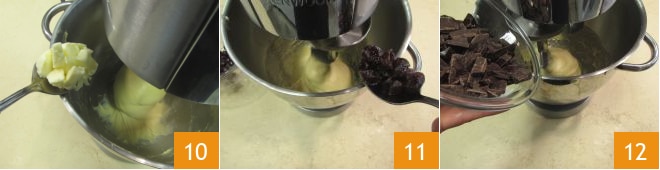 Dann nach und nach die weiche Butter hinzufügen 10. Warten Sie, bis das erste Stück Butter gut aufgenommen ist, bevor Sie das nächste hinzufügen. Die gehackten Sauerkirschen 11 und die Zartbitterschokolade 12 in die Küchenmaschine geben. Etwa 5 Minuten arbeiten, dann die Maschine anhalten und 10 Minuten warten.