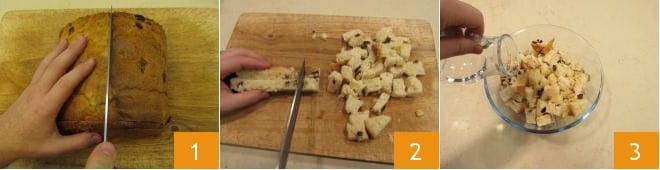 Um den Panettone-Pudding zuzubereiten, beginnen Sie damit, den Panettone 1 in Würfel von etwa zwei Zentimetern zu schneiden 2, dann bestreuen Sie sie mit weißem Rum 3.