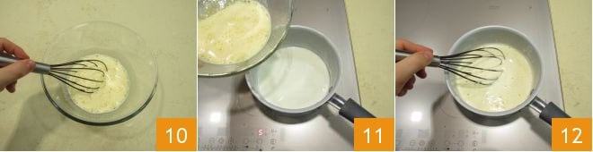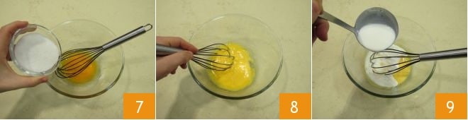In einer Schüssel den Zucker mit den Eigelben kombinieren 7 und für einen Moment mit einem Schneebesen schlagen, bis eine homogene Mischung entsteht 8, dann die inzwischen abgekühlte Milch zum Verdünnen hinzufügen (falls bevorzugt, helfen Sie sich mit einem Schöpflöffel, um die Arbeitsfläche nicht zu verschmutzen) 9.