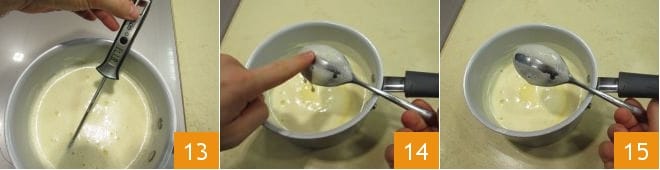 Um wirklich sicher über das Kochen zu sein, verwenden Sie ein Küchenthermometer. Sobald 85° erreicht sind, ist die Creme fertig, über dieser Temperatur besteht das Risiko, dass sich Eier und Milch voneinander trennen und das Ergebnis beeinträchtigen 13. Sie können auch den Löffeltest machen: Stellen Sie sicher, dass die Creme den Löffel überzieht. Dafür müssen Sie nur Ihren Finger über den Rücken des Löffels ziehen 14, die Teile sollten getrennt bleiben, also wird der obere Teil nicht in den unteren tropfen 15.