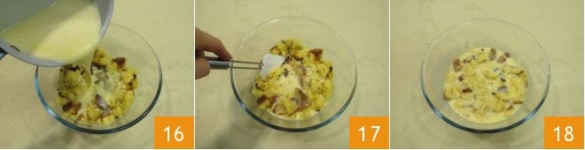 Nachdem Sie die englische Creme einige Minuten abkühlen lassen haben, gießen Sie sie über die Panettone-Würfel 16 und mischen Sie mit einem Spatel 17 bis eine homogene Mischung entsteht 18.