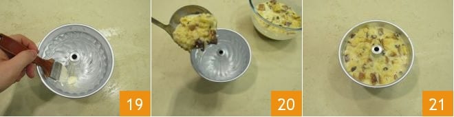 Fetten Sie eine Puddingform mit einem Fassungsvermögen von 500 ml ein 19 und gießen Sie die Creme mit dem Panettone hinein, wenn Sie möchten, helfen Sie sich mit einem Schöpflöffel 20. Schließlich können Sie Ihren Panettone-Pudding 21 in einem auf 160° vorgeheizten statischen Ofen für 50 Minuten backen.