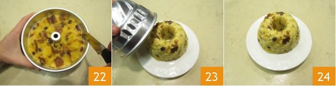 Wenn das Dessert fertig ist, nehmen Sie es aus dem Ofen und lassen Sie es vollständig abkühlen, bei Raumtemperatur, bevor Sie es aus der Form lösen 22 und auf der Servierplatte platzieren 23. An diesem Punkt bleibt Ihnen nichts anderes übrig, als sich der Dekoration zu widmen 24.