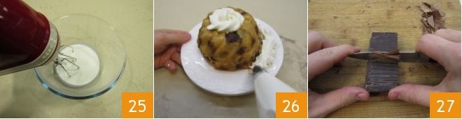 Schlagen Sie die Sahne, indem Sie während des Schlagens mit den elektrischen Schneebesen Puderzucker hinzufügen 25, wenn sie schaumig ist, geben Sie sie in einen Spritzbeutel und dekorieren Sie, beginnend in der Mitte und dann an den Seiten, indem Sie kleine Tupfen um die Basis machen 26. Erhalten Sie Schokoladenspäne, indem Sie ein glattes Messer über die Schokoladentafel ziehen, das Messer leicht neigend, um die Oberfläche zu kratzen 27.