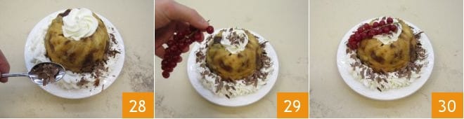 Verteilen Sie die erhaltenen Späne mit einem Löffel, um zu vermeiden, dass sie in den Händen schmelzen 28, und bestreuen Sie alle Sahnehäubchen. Schließlich platzieren Sie einen Zweig Johannisbeeren, um einen Farbtupfer zu geben 29 und Ihr wunderschöner Panettone-Pudding ist bereit zum Servieren 30.