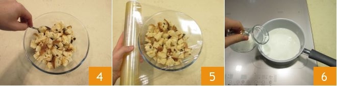 Mischen Sie mit einem Löffel 4 und decken Sie es mit Frischhaltefolie ab, lassen Sie es so für 15 Minuten stehen, die Stücke werden ausreichend einweichen, ohne jedoch an der Luft zu trocknen 5. In der Zwischenzeit bereiten Sie die Englische Creme vor: Gießen Sie in einem Topf die Milch ein, schalten Sie die Flamme auf mittlere Temperatur und lassen Sie sie fast zum Kochen kommen, dann schalten Sie aus und lassen Sie sie einige Minuten abkühlen 6.