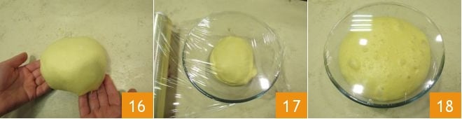Geben Sie dem Teig eine kugelförmige Gestalt 16, geben Sie ihn in eine Glasschüssel, decken Sie ihn mit Frischhaltefolie ab 17 und lassen Sie ihn etwa 12 Stunden bei einer Temperatur von etwa 26°C gehen, bis der Teig sein Volumen verdreifacht hat 18. In der Zwischenzeit, wenn Sie die Mandarinen-, Orangen- oder Zitronenpaste zu Hause zubereiten möchten, schauen Sie in die Box unten.