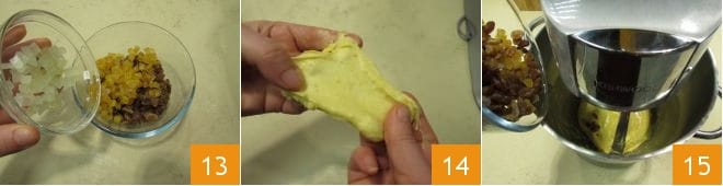 Zu diesem Zeitpunkt lassen Sie die Rosinen gut abtropfen und geben Sie sie in eine Schüssel, fügen Sie auch die Orangen und Zitronat hinzu und mischen Sie 13. Um sicherzustellen, dass der Teig bereit ist, stoppen Sie die Maschine, nehmen Sie ein Stück davon und wenn es sich beim Ausbreiten mit den Händen dünn zieht, aber nicht leicht reißt, bedeutet dies, dass es die richtige Elastizität erreicht hat 14; wenn nicht, arbeiten Sie den Teig noch ein paar Minuten, andernfalls fügen Sie die kandierten Früchte und die Rosinen zur Küchenmaschine hinzu 15 und schalten Sie sie erneut bei mäßiger Geschwindigkeit ein.