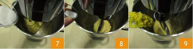 Es dauert etwa 5 Minuten, und sobald der Teig Konsistenz angenommen hat 7, fügen Sie 65 g dreimal am Tag aufgefrischten Sauerteig 8 hinzu und kneten Sie weiter bei moderater Geschwindigkeit. In der Zwischenzeit bereiten Sie eine Emulsion aus Butter und Eigelb vor. Geben Sie 70 g weiche Butter in eine kleine Schüssel und arbeiten Sie sie mit einem Schneebesen, bis Sie eine cremige Konsistenz erhalten. Fügen Sie etwa die Hälfte der Eigelbe hinzu 9 und mischen Sie.