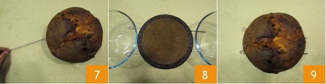 und stechen Sie ihn an den beiden äußeren Rändern mit 2 Stahlspießen 7. Lassen Sie ihn die ganze Nacht kopfüber abkühlen, indem Sie zwei Töpfe oder zwei Schüsseln derselben Höhe verwenden, um ihn zu fixieren 8. Am nächsten Morgen drehen Sie ihn um, entfernen Sie die Spieße und Ihr Panettone ist bereit zum Genießen 9!