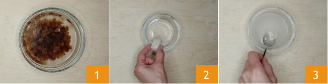 Um das römische Pangiallo herzustellen, weichen Sie zuerst die Sultaninen 30 Minuten lang in 300 g lauwarmem Wasser ein 1, drücken Sie diese dann aus, um das überschüssige Wasser zu entfernen. Lösen Sie 10 g Bierhefe in 40 g lauwarmem Wasser auf 2 und rühren Sie mit einem Teelöffel um 3.