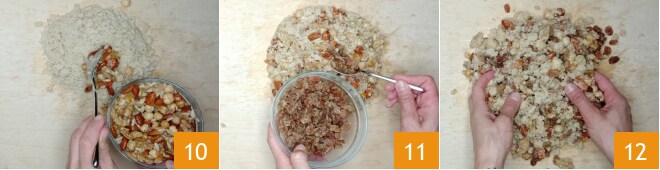 Fügen Sie die Früchte zum Teig hinzu 10, geben Sie auch die gut ausgedrückten Rosinen 11 dazu und kneten Sie von Hand 12.