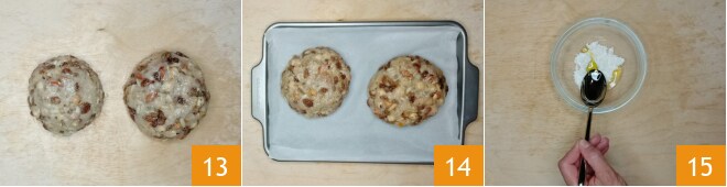 Befeuchten Sie Ihre Hände mit Wasser und formen Sie zwei Brote 13. Legen Sie diese auf ein mit Backpapier ausgelegtes Backblech 14, bedecken Sie sie mit Frischhaltefolie und lassen Sie sie 12 Stunden im ausgeschalteten und geschlossenen Ofen ruhen. Nach der Ruhezeit bereiten Sie einen Teig mit dem Mehl, dem Öl 15,