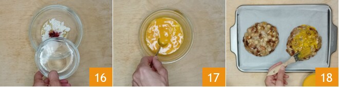 dem Safran und dem Wasser 16, rühren Sie mit einem Löffel um 17 und bestreichen Sie die Brote mit dem erhaltenen Teig 18.