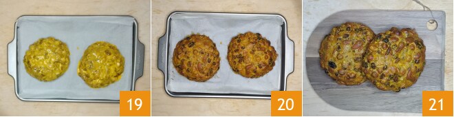 Die Oberfläche sollte gut glasiert sein 19. Backen Sie im vorgeheizten statischen Ofen bei 170 °C für 45 Minuten. Nach dem Backen nehmen Sie das Pangiallo aus dem Ofen 20 und lassen es abkühlen, bevor Sie es genießen 21.