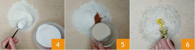 Formen Sie einen Brunnen mit dem Mehl und fügen Sie den Zucker 4 und den Zimtpulver hinzu, gießen Sie die in Wasser gelöste Hefe 5 hinein und beginnen Sie, die Zutaten zu kneten. Fügen Sie auch das Olivenöl 6 hinzu.