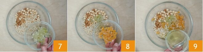 Geben Sie in eine Schüssel die Trockenfrüchte (Pinienkerne, Mandeln, Haselnüsse und Walnüsse), die kandierte Zitronenschale 7, die kandierte Orange 8, das Eiweiß 9 und mischen Sie mit einem Löffel.