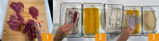Um die panierten Schnitzel zuzubereiten, klopfen Sie sie zuerst, falls sie zu dick sind 1. Wenden Sie sie dann zuerst im Mehl 2 und anschließend in den zuvor verquirlten Eiern 3.