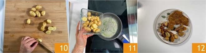 Wenn Sie eine raffinierte Beilage suchen, probieren Sie unsere Butterkartoffeln. Waschen und halbieren Sie die neuen Kartoffeln 10. Geben Sie die Butter und die Kräuter in eine Pfanne, lassen Sie sie schmelzen und fügen Sie dann die Kartoffeln hinzu 11. Kochen Sie sie sanft etwa zwanzig Minuten lang, rühren Sie gelegentlich um; salzen und pfeffern Sie nach Geschmack. Servieren Sie die Butterkartoffeln mit unseren panierten Schnitzeln 12.
