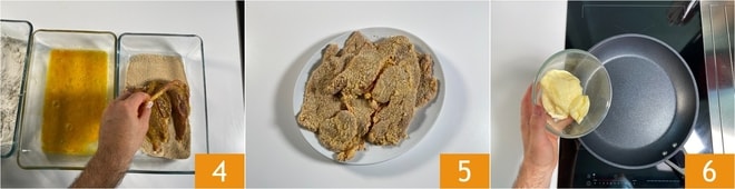 Zum Schluss wenden Sie sie im Paniermehl 4. Achten Sie zwischen den einzelnen Phasen darauf, sie immer abzuklopfen, um den Überschuss zu entfernen. Fahren Sie so fort, bis alle 4 Schnitzel paniert sind, und legen Sie sie nach und nach auf einen Teller 5. An diesem Punkt geben Sie die geklärte Butter in eine große Pfanne 6.