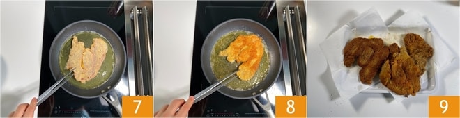 Wenn die Butter gut geschmolzen und heiß ist, tauchen Sie das erste Schnitzel ein 7. Lassen Sie es 2-3 Minuten bräunen, dann drehen Sie es mit einer Zange um und warten Sie weitere 2-3 Minuten. Heben Sie es heraus und legen Sie es auf ein Tablett mit Küchenpapier, um das überschüssige Fett zu entfernen 9. Salzen und servieren Sie Ihre panierten Schnitzel noch heiß!