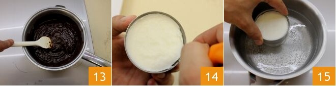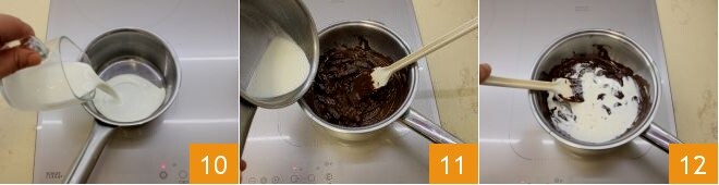 In der Zwischenzeit erwärmen Sie die frische Sahne in einem kleinen Topf 10 und wenn die Schokolade zu schmelzen beginnt, fügen Sie sie im Wasserbad hinzu 11, rühren Sie mit einem Holzlöffel um 12, damit die Schokolade vollständig schmilzt.