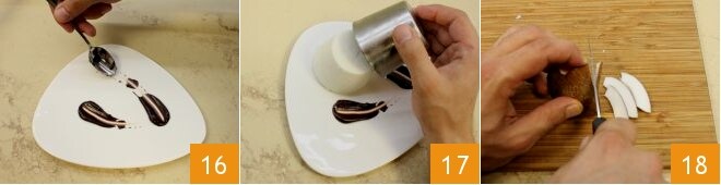 Jetzt kommt das Anrichten; dekorieren Sie mit der Rückseite eines Löffels den Servierteller nach Belieben mit der vorbereiteten Schokoladensoße 16, stürzen Sie dann die Panna Cotta auf den Teller 17 (falls nötig, geben Sie ein paar kleine Schläge, um sie zu lösen). Schneiden Sie anschließend mit einem Messer den frischen Kokos in dünne Scheiben 18;