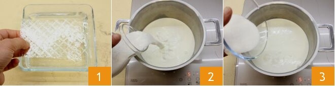 Um die Kokospanna-Cotta mit Schokoladensoße zuzubereiten, beginnen Sie zunächst damit, die Gelatineblätter in einem Behälter mit kaltem Wasser einzuweichen 1 und sie mindestens 10 Minuten lang vollständig weich werden zu lassen. In der Zwischenzeit erhitzen Sie in einem kleinen Topf bei schwacher Hitze, aber ohne zu kochen, die Sahne zusammen mit der Kokosmilch 2 und dem Zucker 3, gut mit dem Schneebesen umrühren.