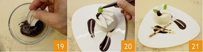 nehmen Sie 3 Scheiben und tauchen Sie die Spitze in die Schokoladensoße 19, dann beenden Sie, indem Sie sie auf die Oberseite der Panna Cotta legen 20 und fügen Sie auch zwei Minzblätter hinzu (wenn Sie möchten, können Sie zusätzlich mit der restlichen Soße dekorieren). Servieren Sie schließlich die Kokospanna-Cotta mit Schokoladensoße 21.