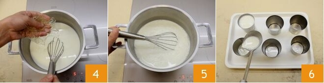 Sobald die Mischung den Siedepunkt erreicht hat, schalten Sie die Hitze ab, warten Sie einen Moment und drücken Sie die Gelatineblätter gut aus, bevor Sie sie der Mischung hinzufügen 4, gut umrühren, bis sie sich vollständig aufgelöst hat 5 (falls Klumpen vorhanden sind, passieren Sie alles durch ein feines Sieb). Bereiten Sie nun auf einem Tablett 6 Formen mit einem Fassungsvermögen von 150 ml vor, indem Sie das Innere mit Wasser benetzen (dieser Vorgang hilft Ihnen, die Panna Cotta nach dem Erstarren besser herauszulösen), und füllen Sie dann die Panna Cotta mit einer Kelle bis zum Rand 6.
