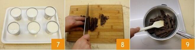 Nachdem Sie diese Operation abgeschlossen haben 7, stellen Sie die Kokospanna-Cotta für mindestens 3 Stunden in den Kühlschrank, um sie fest werden zu lassen. Eine halbe Stunde vor dem Servieren der Panna Cotta bereiten Sie die Schokoladensoße zu: Hacken Sie die Zartbitterschokolade mit einem Messer 8 und geben Sie sie dann in eine Metallschüssel (oder einen kleineren Topf), um sie im Wasserbad zu schmelzen 9, wobei darauf zu achten ist, dass das darunterliegende Wasser nicht in direkten Kontakt mit dem Boden des Behälters kommt.