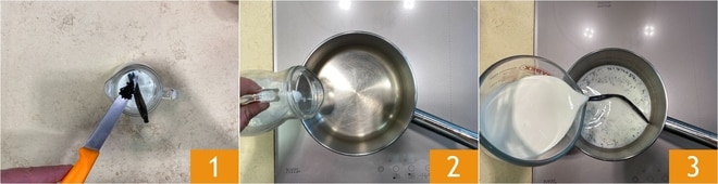 Um die Panna Cotta mit Zitrussauce zuzubereiten, geben Sie zuerst die Milch, die Samen einer Vanilleschote und die Vanilleschote selbst 1 in eine kleine Schüssel. Stellen Sie sie über Nacht in den Kühlschrank. Dann gießen Sie sie in einen kleinen Topf 2 und fügen auch die Sahne hinzu 3.