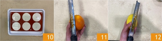Stellen Sie sie für 12 Stunden in den Kühlschrank, um sie zu festigen 10. Bereiten Sie inzwischen die Zitrussauce vor. Reiben Sie die Orangenschale 11, die Zitronenschale 12 und legen Sie sie beiseite.