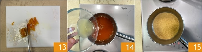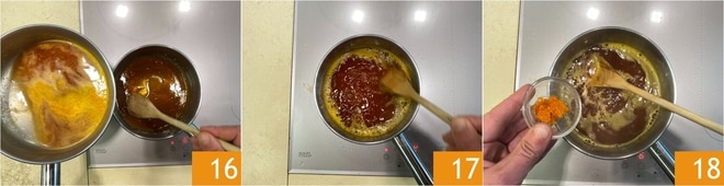 Gießen Sie dann den heißen Saft in 3 Portionen 16, wobei Sie sehr vorsichtig sein sollten. Zum Schluss umrühren 17 und die Orangenschale hinzufügen 18.