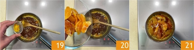 Fügen Sie auch die Zitronenschale 19 und die Orangensegmente hinzu 20. Lassen Sie es einige Minuten kochen 21.