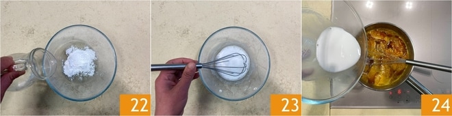 Geben Sie in eine kleine Schüssel die Maisstärke und den Orangenlikör 22, rühren Sie gut mit einem Schneebesen und gießen Sie die Mischung in den Topf 24.