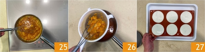 Rühren Sie gut und kochen Sie noch ein paar Minuten 25, dann sieben Sie die Mischung 26 und lassen Sie sie vollständig abkühlen. Wenn die Panna Cotta fertig ist, können Sie sie aus den Formen nehmen 27.