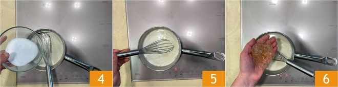 Fügen Sie den Zucker hinzu 4 und rühren Sie um 5. Sobald es fast kocht, fügen Sie die zuvor eingeweichte Gelatine hinzu 6. Rühren Sie, bis sie sich vollständig aufgelöst hat.