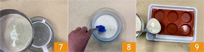 Filtern Sie die Mischung in eine Schüssel 7 und stellen Sie sie in eine andere Schüssel mit Wasser und Eis. Rühren Sie einige Minuten 8; auf diese Weise verteilen sich die Samen gleichmäßig, während die Mischung zu verdicken beginnt. Gießen Sie sie dann in 6 Förmchen à 80 g 9.