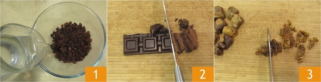 Um den hausgemachten Pfefferkuchen herzustellen, waschen Sie zuerst die Rosinen und lassen Sie sie etwa 20 Minuten in Wasser einweichen 1. In der Zwischenzeit bereiten Sie die anderen Zutaten vor: Hacken Sie die Zartbitterschokolade fein 2, dann schneiden Sie die kandierte Orange und die getrockneten Feigen in Stücke 3.
