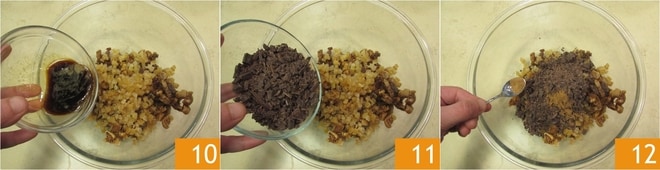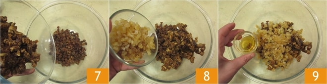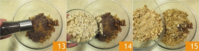Pfeffern Sie 13, dann fügen Sie auch die Mandeln 14, die Walnüsse und die Haselnüsse 15 hinzu.