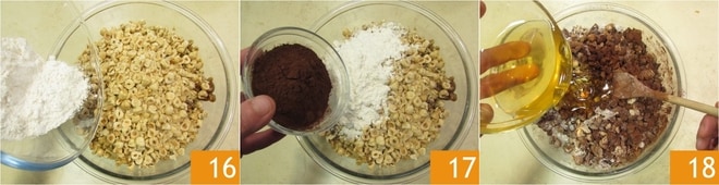 Zum Schluss geben Sie das Mehl 16 und den Kakao 17 hinzu. Beginnen Sie mit einem Holzlöffel zu mischen, während Sie auch den Honig 18 hinzufügen.