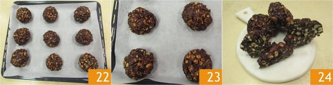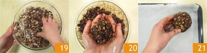 Nachdem Sie alles vermengt haben, kneten Sie weiter mit den Händen, bis eine möglichst homogene Masse entsteht 19. An diesem Punkt fetten Sie Ihre Hände mit Olivenöl ein und formen Sie Kugeln von etwa 130 g Gewicht; mit diesen Mengen sollten Sie 9 Stück bekommen 20. Legen Sie die Kugeln nach und nach auf ein mit Backpapier ausgelegtes Backblech 21.
